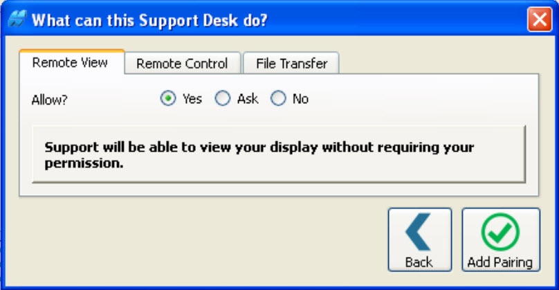 - Ask: Allows the support desk to perform the function afer the control box is prompted and gives permission.